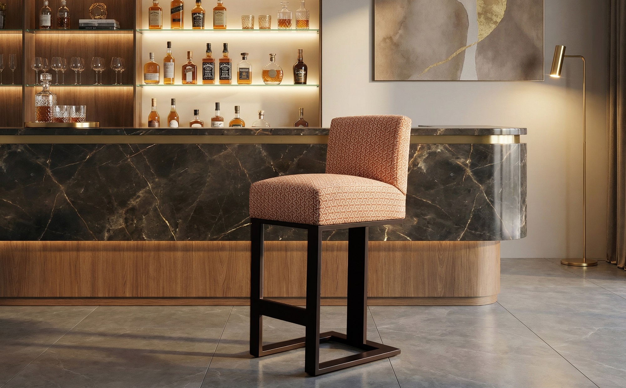 Custom-made and hand-upholstered, it stands out for its imposing metal plinth. Elegant and comfortable at the same time, it adds personality and style to your room.