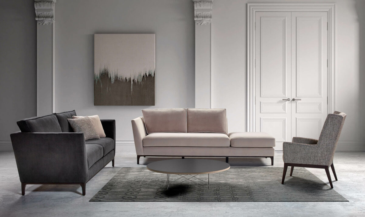 Le canapé GRIMAUD incarne l'élégance et le confort dans un style classique, rehaussé d'un socle en bois qui apporte de la sophistication.