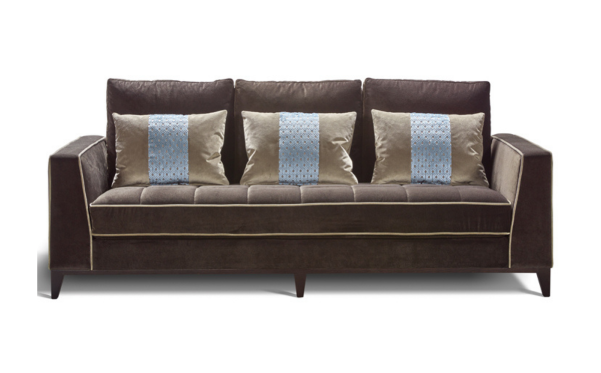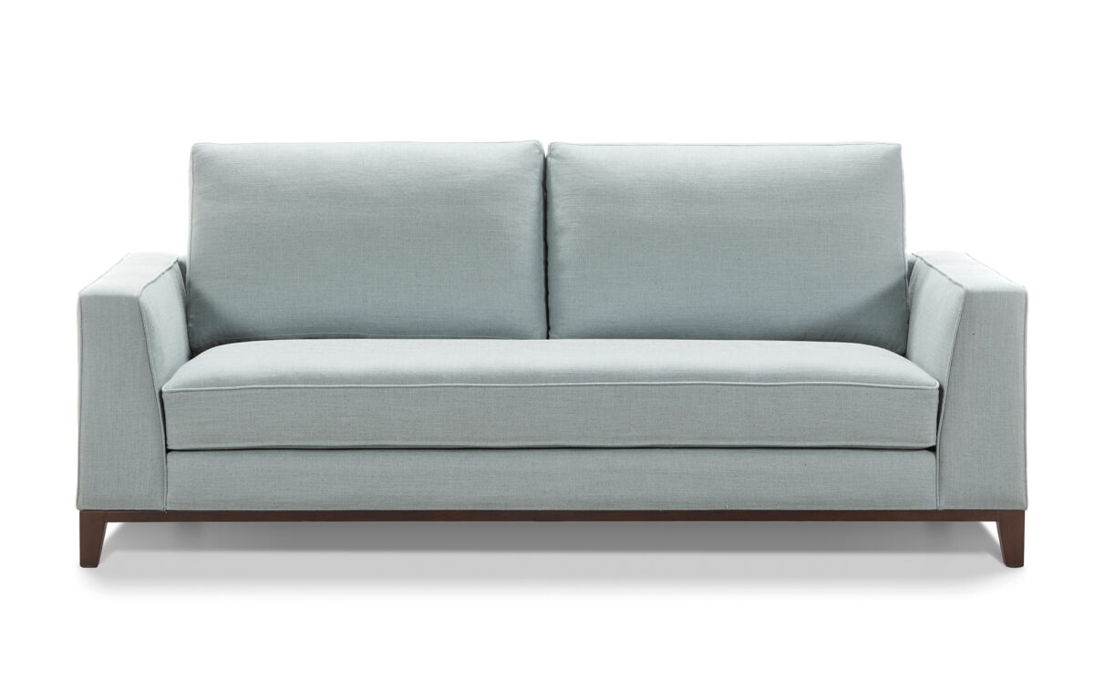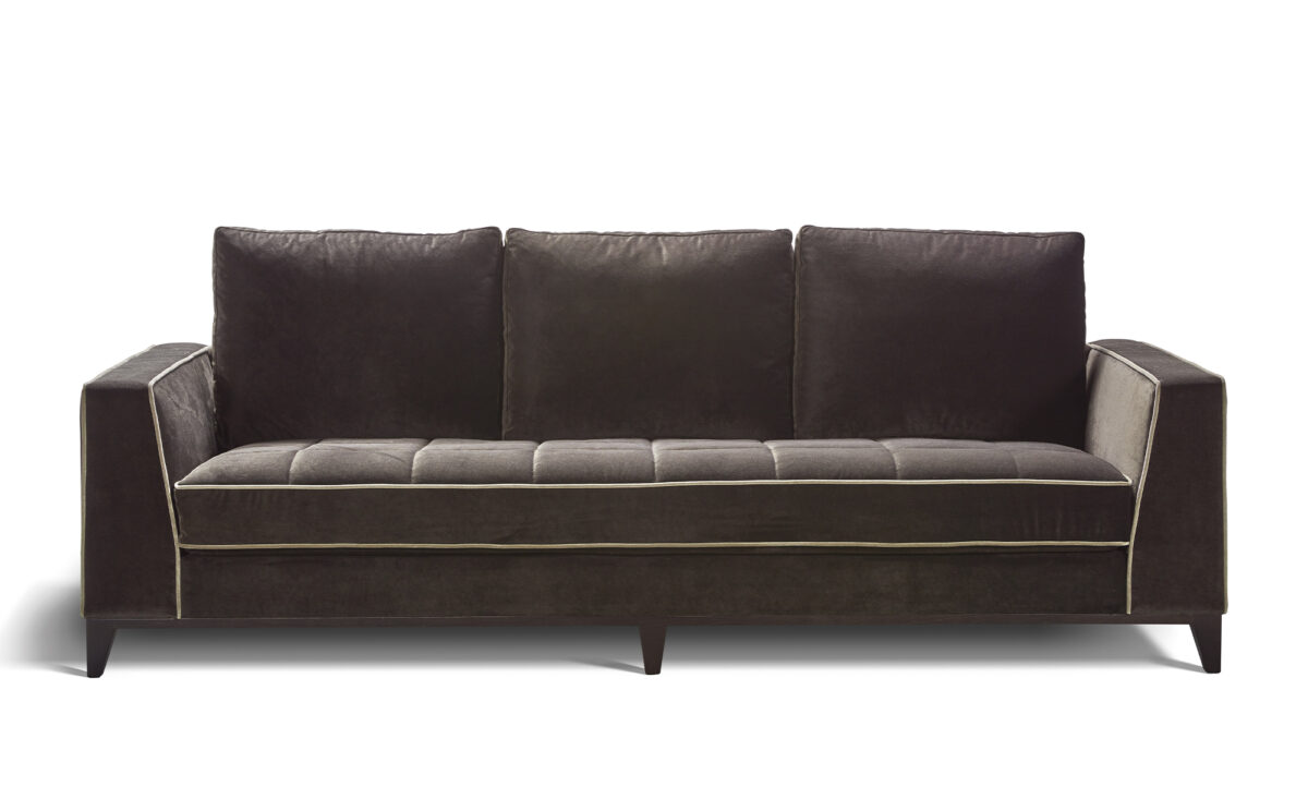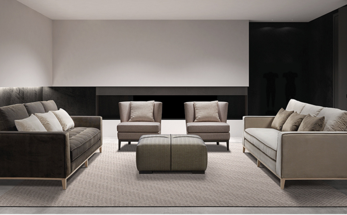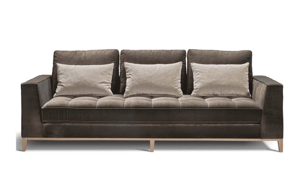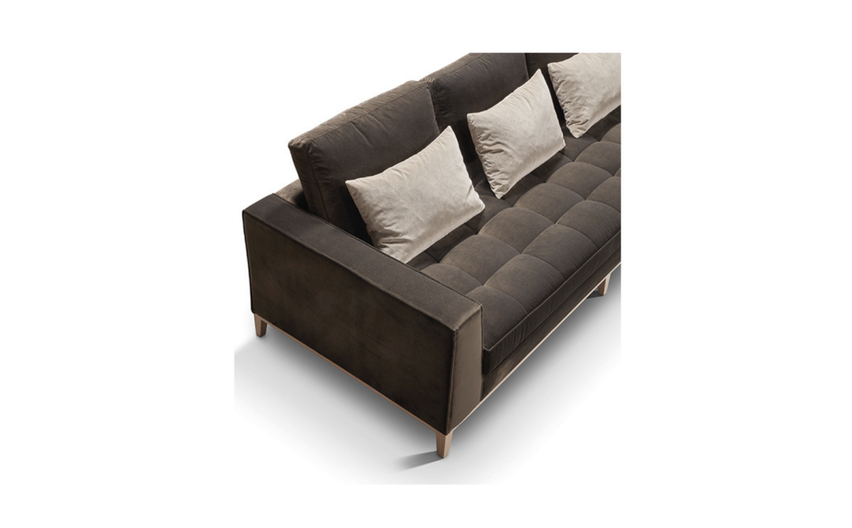Un sofá a medida que irradia sobriedad y elegancia a través de sus líneas rectas contemporáneas y proporciones equilibradas, realizadas por un zócalo de madera.